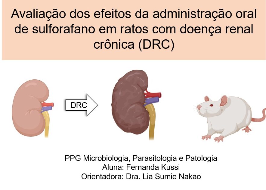 Fernanda Kussi, estudante de mestrado, defendeu sua dissertação intitulada “Avaliação dos efeitos da administração oral de sulforafano em ratos com doença renal crônica” pelo PPG Microbiologia, Parasitologia e Patologia em 27 de fevereiro de 2023, online.